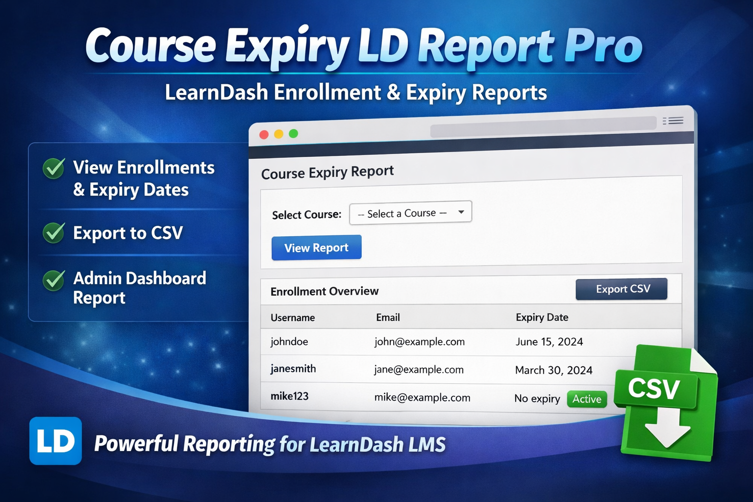 Course Expiry LD Report Pro is a lightweight yet powerful reporting plugin built specifically for LearnDash LMS websites.
